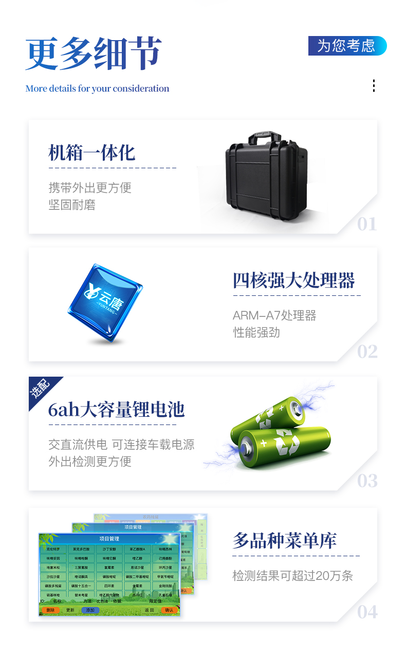 | 隨著人民生活水平的不斷提升,市場對茶葉的把控愈加嚴格。針對現狀,我司專門研發生產--茶葉專用的農藥殘留速測儀;定位茶農、茶商、茶葉企業使用。 此外還可用于果蔬茶生產基地和農貿批發銷售市場現場檢測,餐館、學校、食堂、家庭果蔬加工前的安全速測等。 | 檢測通道: 5個檢測通道,可以同時測試多個樣品,每個樣品由程序控制分別獨立工作,不會互相干擾。 | 顯示方式:≥5英寸液晶觸摸屏顯示,人性化中文操作界面,讀數直觀、簡單。 | 配備嵌入式高速熱敏打印機,可選擇手動打印或者自動打印,三分鐘出打印結果。 | 光源采用進口超高亮發光二極管,具有低功耗、穩定性強、高靈敏度,高檢測精度,高重復性精度,光源可控、響應速度快等優點。 | 采用標準USB接口設計,免驅動安裝,方便數據的存貯和移動,并可隨時與計算機直接相連,并且可用計算機控制儀器。實現數據查詢、瀏覽、分析、統計、打印等。 | 智能化程度高,儀器具有自檢功能:具有開機自檢和調零功能,具有自動檢測重復性功能 | 內置強大的數據庫,可在儀器上直接選擇樣品名稱、檢測指標、送檢單位等信息,也可在儀器上直接編輯錄入樣品名稱、檢測指標、送檢單位等信息并保存進樣品數據庫。 | 支持Wifi網絡,數據可局域網和互聯網數據上傳,檢測結果直接傳至食品安全監管平臺。進行區域食品安全監管及大數據分析處理,檢測區域食品安全長短期動態,達到食品安全問題預估、預警 |