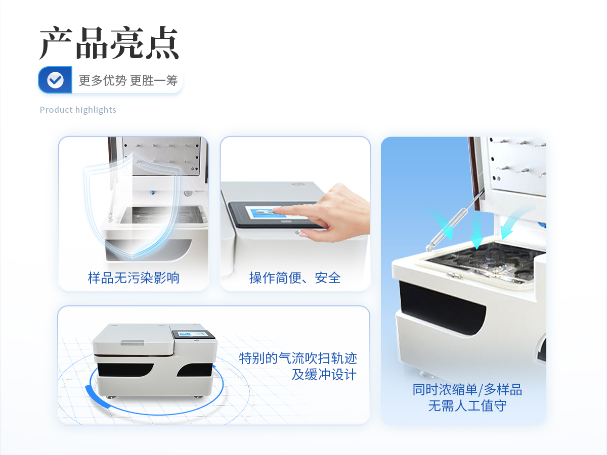 全自動多功能干式氮吹儀HM-QD24是我司結合實驗室使用需求,從使用者方便安全快捷穩定等多角度共同開發的新型濃縮定容產品,產品擺脫了常規市場上利用水浴加熱揮發而導致樣品進行污染的弊端,確定樣品的安全性與準確性,具有無人值守、準確定容、大批量濃縮的特點,可多組數據儲存功能,實現了全自動化的定量及批量濃縮,濃縮全程,讓繁瑣的濃縮過程變得靈活、省心、**和安全。