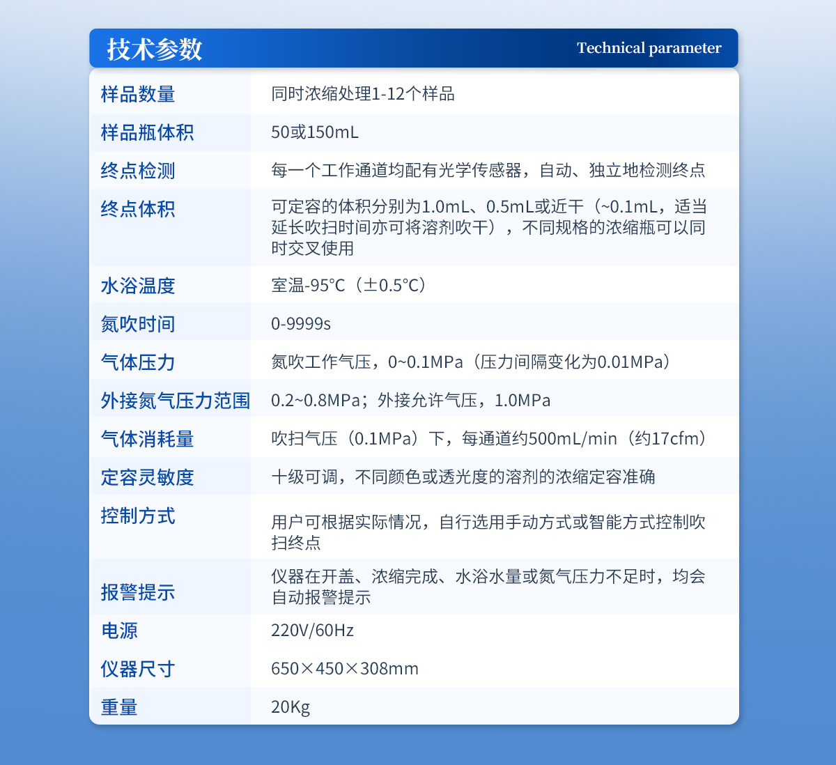 | 1、 樣品數量:可同時濃縮處理1~24個樣品; | 2、 濃縮瓶容積:100ml或150ml | 3、 終點檢測:每一個工作通道均配有光學化感器,自動、獨自檢測終點,無需人工看管; | 4、終點體積:自動感應的定容體積人別為1.0ml、0.5ml或近干(約0.1ml,定容規格選配),適當延長時間亦可將溶劑吹干,不同規格的濃縮瓶可以同時交叉使用; | 5、工作參數任意設置、控制和實時顯示:主要工作參數,溫度、氮吹時間和氣體壓力; | 6、溫度設定:室溫~95℃(±0.5℃); | 7、氮吹時間:0~9999sec; | 8、氣體壓力:氮吹工作吹掃氣壓,0~0.50mpa范圍內任意設定,儀器自帶自動調壓裝置,可自動調節至所設定的吹掃壓力并保持恒定,不受工作通道(樣品)突然開啟、關閉或數量的影響;外接氮氣壓力(氮氣鋼瓶分壓表壓力)范圍:0.10~0.50mpa;外接極限氣體壓力:0.7mpa; | 9、氣體消耗量:吹掃壓力(0.10mpa)下,每通道約500ml/min(約17cfm); | 10、定容靈敏度:十級可調,不同顏色或透光度的溶劑的濃縮定容準確; | 11、控制方式:用戶可根據實際情況,自行選用手動方式或智能方式控制吹掃終點; | 12、報警提示:儀器在開蓋、濃縮完成、氮氣壓力不足時,均會顯示; | 13、儀器運行中途開蓋,自動智能記憶工作狀態,儀器繼續執行之前被中止的程序,無需重新設置工作參數及工作通道; | 14、所有橡膠配件均采用無增塑劑的硅膠制造,避免樣品收到來自儀器的污染; | 15、靈活的工作參數設定、方便的樣品置入/取出過程,免去繁瑣的準備工作,減低了有機溶劑對操作人員的毒害; | 16、密閉式結構設計及自帶的強力排風系統可將有機揮發成份和水蒸氣集體統一排出,避免了有機溶劑在實驗操作空間的揮發擴散,保障了操作人員的身體健康,并避免了對壞境的污染; | 17、儀器利用干式加熱方式,方便了用戶更換加熱用水; | 18、輸入電源:220V/60Hz; | 19、儀器重量:20kg |