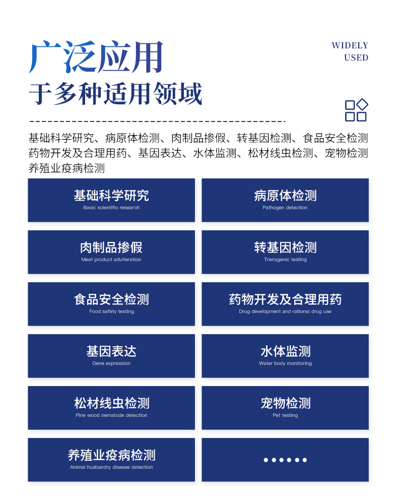 基礎科學研究、病原體檢測、寵物檢測、養(yǎng)殖業(yè)疫病檢測(牛羊、雞鴨鵝等禽類、魚蝦等水產(chǎn))