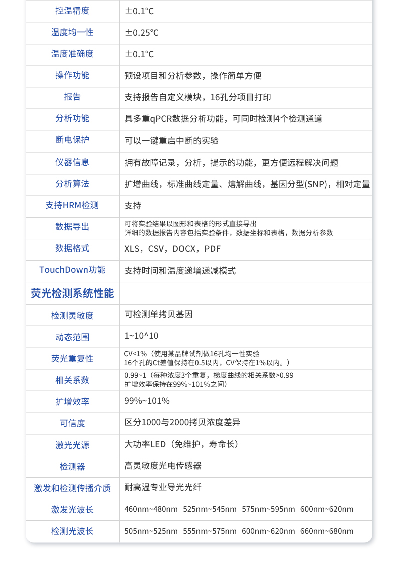 | 基本性能 | 外形尺寸:270*352*195 (mm) | 重量:7.1kg | 電源:220V | 功率:**工作功率300w | 操作系統(tǒng):自帶Android操作系統(tǒng) | 外接電腦:外接windows電腦(win7系統(tǒng)以上) | 系統(tǒng)語言:中英文實時切換 | 通信接口:方形USB | 操作環(huán)境參數(shù) | 操作環(huán)境溫度:18~35℃ | 操作環(huán)境相對濕度:0%~85% | 運輸及儲存溫度:-20~55℃ | 運輸及儲存相對濕度:0%~85% | 系統(tǒng)性能 | 樣品容量:16孔*0.2ml | 樣品容積:15~100ul | 適用耗材:0.2ml單管、8×0.2ml排管 | 控溫范圍:4~99℃ | 熱蓋溫度:30℃-108℃(默認105℃,熱蓋溫度可調) | 溫控方式:高性能進口半導體 | 梯度控溫:3模塊梯度控溫,**溫差支持35℃ | 升溫速率:4.5℃/s(MAX) | 降溫速率:3.4℃/s(MAX) | 控溫精度:±0.1℃ | 溫度均一性:±0.25℃ | 溫度準確度:±0.1℃ | 操作功能:預設項目和分析參數(shù),操作簡單方便 | 報告:支持報告自定義模塊,16孔分項目打印 | 分析功能:具多重qPCR數(shù)據(jù)分析功能,可同時檢測4個檢測通道 | 斷電保護:可以一鍵重啟中斷的實驗 | 儀器信息:擁有故障記錄,分析,提示的功能,更方便遠程解決問題 | 分析算法:擴增曲線,標準曲線定量、熔解曲線,基因分型(SNP),相對定量 | 支持HRM檢測:支持 | 數(shù)據(jù)導出:可將實驗結果以圖形和表格的形式直接導出;詳細的數(shù)據(jù)報告內容包括實驗條件,數(shù)據(jù)坐標和表格,數(shù)據(jù)分析參數(shù)。 | 數(shù)據(jù)格式:XLS, CSV, DOCX,PDF | TouchDown功能:支持時間和溫度遞增遞減模式 | 熒光檢測系統(tǒng)性能 | 檢測靈敏度:可檢測單拷貝基因 | 動態(tài)范圍:1~10^10 | 熒光重復性:CV<1%(使用某品牌試劑做16孔均一性實驗,16個孔的Ct差值保持在0.5以內,CV保持在1%以內。) | 相關系數(shù):0.99~1(每種濃度3個重復,梯度曲線的相關系數(shù)>0.99,擴增效率保持在99%~101%之間) | 擴增效率:99%~101% | 可信度:區(qū)分1000與2000拷貝濃度差異 | 激光光源:大功率LED(免維護,壽命長) | 檢測器:高靈敏度光電傳感器 | 激發(fā)和檢測傳播介質:耐高溫專業(yè)導光光纖 | 激發(fā)光波長:460nm~480nm , 525nm~545nm, 575nm~595nm ,600nm~620nm | 檢測光波長:505nm~525nm , 555nm~575nm , 600nm~620nm , 660nm~680nm |