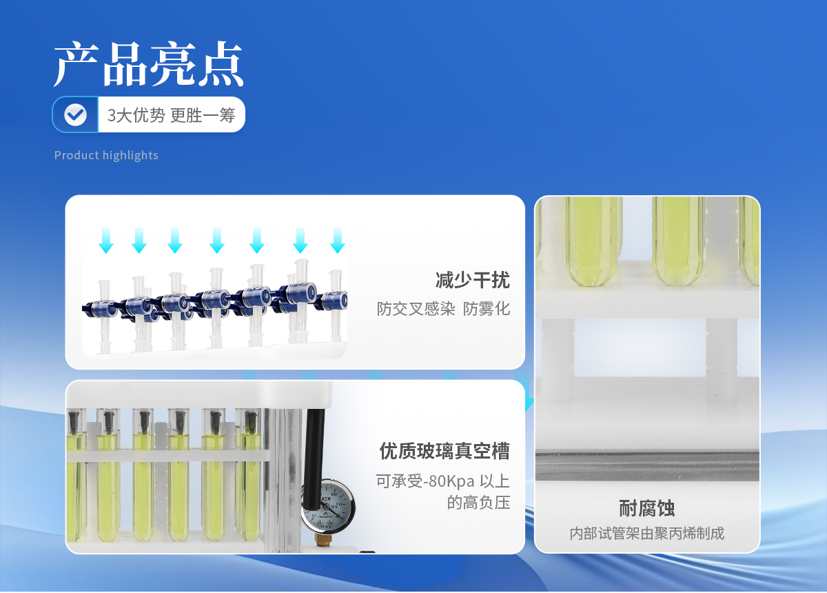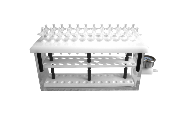 | *固相萃取裝置整機由透明有機玻璃制作,耐腐蝕性強。 | *真空槽其壁厚均勻故可承受-0.096Mpa 以上的高負壓,長期高壓使用不變形。 | *各處受壓均勻, 氣密性好,穩定性強。 | *萃取速度一致性好、控制調整方便。 | *多通道可獨立控制, 接頭耐腐蝕。 | *產品內部試管架由聚四氟制成故有耐腐蝕性。 |
