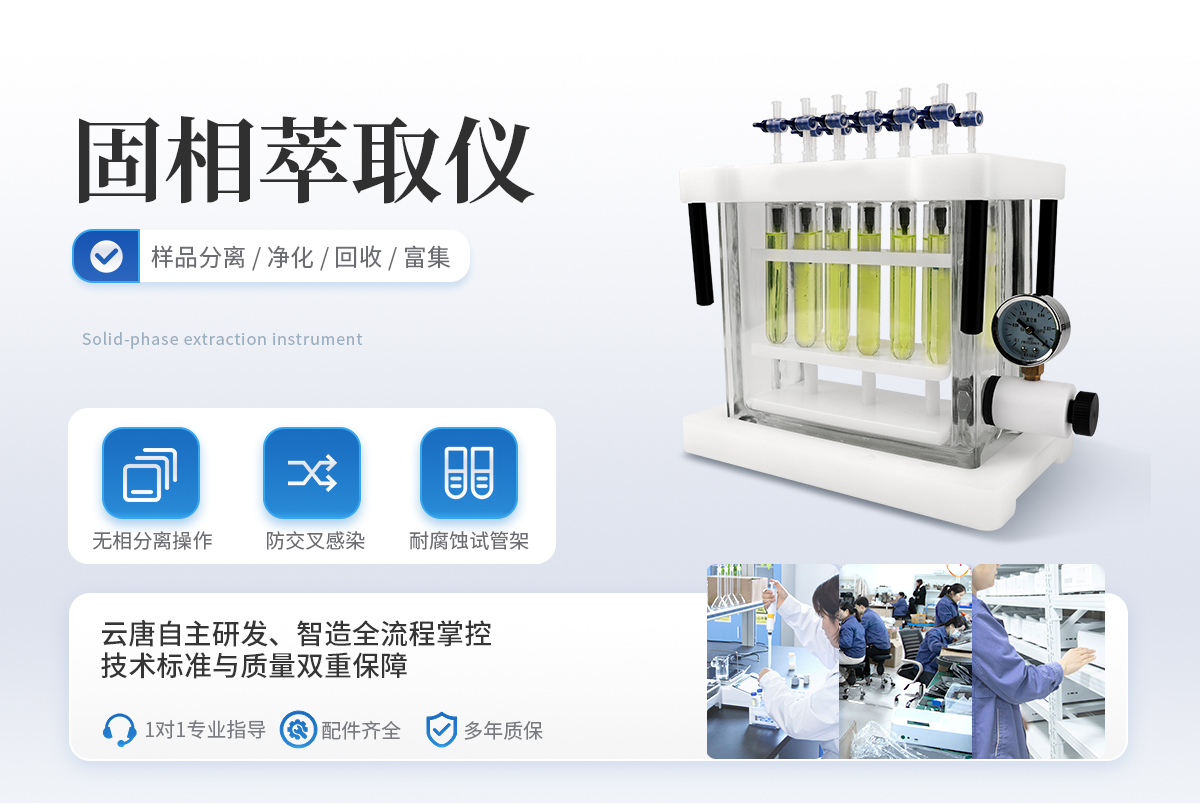 固相萃取儀 (方形)裝置是利用固體吸附劑將液體樣品中的目標化合物吸附,與樣品的基體和干擾化合物分離,然后再用洗脫液洗脫或加熱解吸附,達到分離和富集目標化合物的目的(即樣品 的分離, 凈化和富集), 目的在于降低樣品基質干擾, 提高檢測靈敏度。
