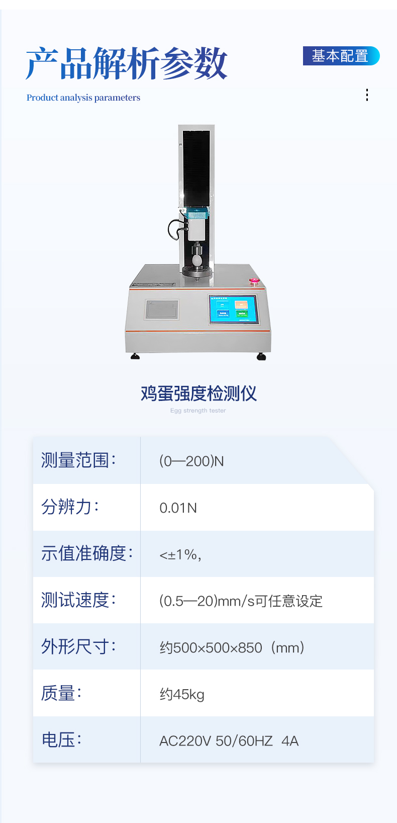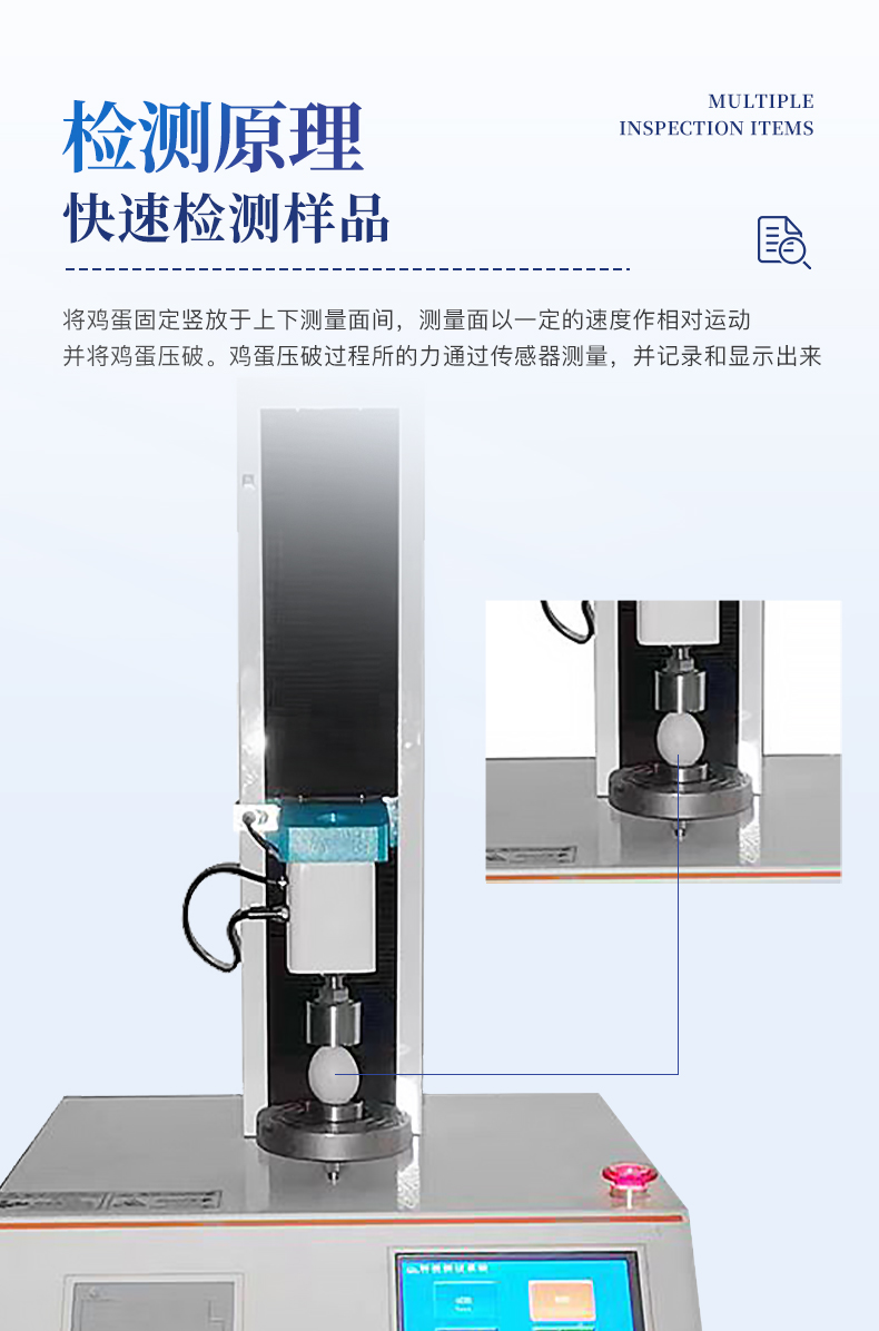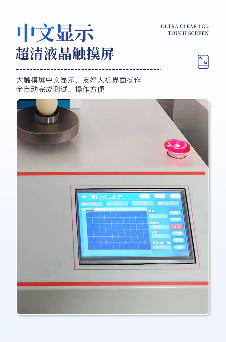 | 1、采用芯片控制,高精度測力傳感器,精度高。 | 2、采用高性能步進電機,精密滾珠絲桿傳動,保證該儀器傳動精準。 | 3、大觸摸屏中文顯示,友好人機界面操作。全自動完成測試。操作方便,具有測試數據統計處理功能,微型打印機輸出。 | 4、隨機配備蛋殼豎立固定裝置,方便快速測量。 |