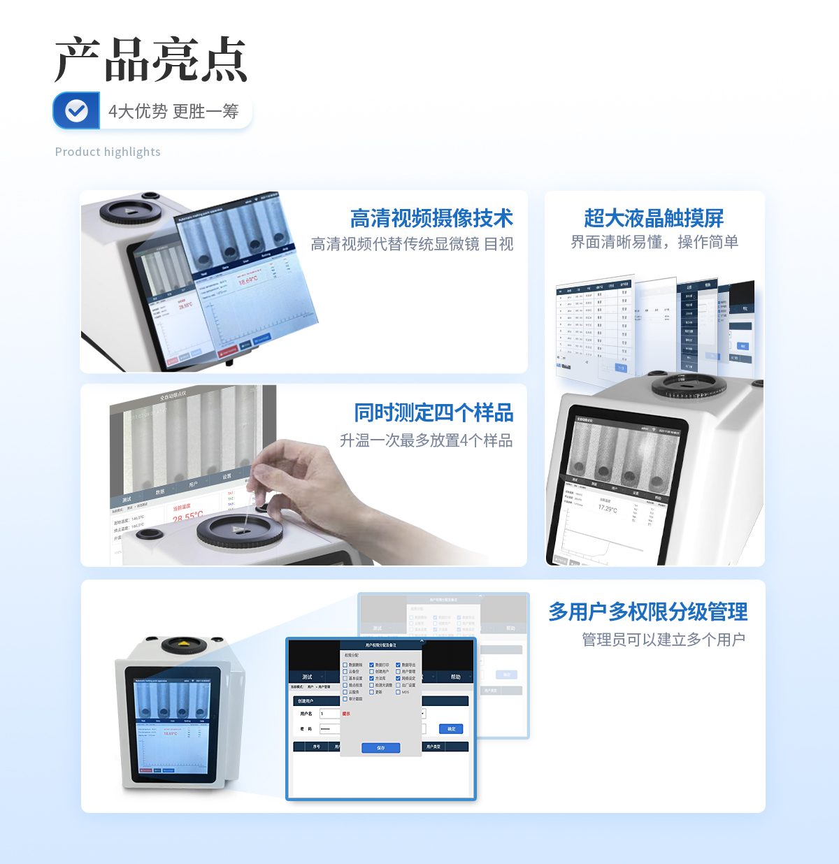 | 1、自動化集成,實現一鍵測定功能; | 2、一次處理4個樣品; | 3、高清視頻代替傳統顯微鏡 目視高; | 4、半自動記錄熔程,初熔,終熔; | 5、可通過打印機直接打印數據; | 6、符合21CFR Part 11、審計追蹤、藥典及電子簽名 | 7、符合GLP要求規范; | 8、符合藥典2015。 |