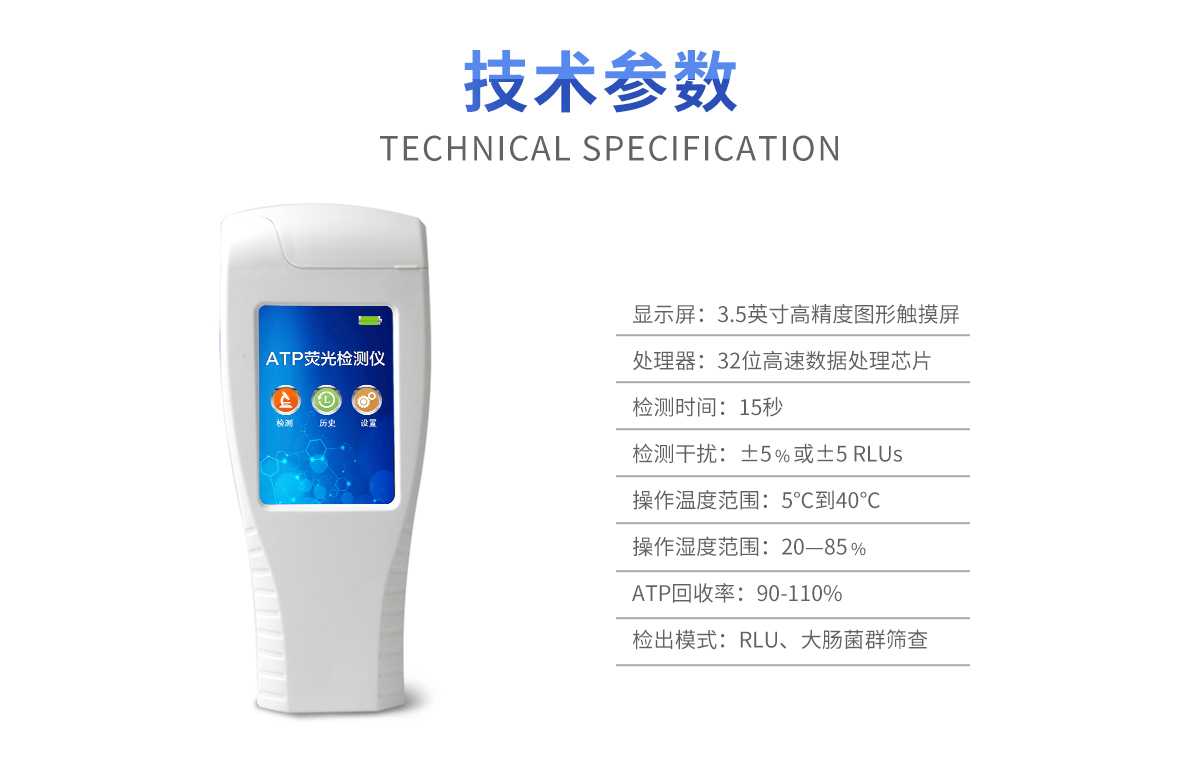 該設(shè)備為全新升級產(chǎn)品,大屏幕觸摸顯示屏,代替?zhèn)鹘y(tǒng)按鍵。操作采用生物化學(xué)反應(yīng)方法檢測ATP含量,ATP熒光檢測儀基于螢火蟲發(fā)光原理,利用“熒光素酶—熒光素體系”快速檢測三磷酸腺苷(ATP)。ATP拭子含有可以裂解細(xì)胞膜的試劑,能將細(xì)胞內(nèi)ATP釋放出來,與試劑中含有的特異性酶發(fā)生反應(yīng),產(chǎn)生光,再用熒光照度計檢測發(fā)光值,微生物的數(shù)量與發(fā)光值成正比,由于所有生物活細(xì)胞中含有恒量的ATP,所以ATP含量可以清晰地表明樣品中微生物與其他生物殘余的多少,用于判斷衛(wèi)生狀況。