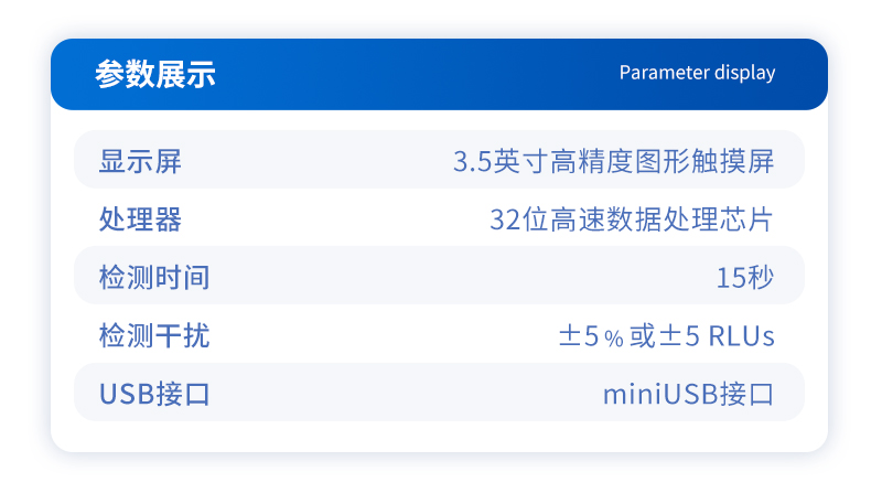 | 顯示屏:3.5英寸高精度圖形觸摸屏 | 處理器:32位高速數(shù)據(jù)處理芯片 | 檢測限:1.0×10^-13mol ATP | 檢測時間:15秒 | 檢測干擾:±5﹪或±5 RLUs | 操作溫度范圍:5℃到40℃ | 操作濕度范圍:20—85﹪ | ATP回收率:90-110% | 檢出模式:RLU | 50個用戶ID 設(shè)定 | 可設(shè)定的結(jié)果限值個數(shù):251個 | 自動判斷合格與不合格 | 自動統(tǒng)計合格率 | 內(nèi)置自校光源 | 開機(jī)30秒自檢 | 配有miniUSB接口,可將結(jié)果上傳至PC | 配備專用軟件驅(qū)動U盤代替?zhèn)鹘y(tǒng)光盤 | 儀器尺寸(W×H×D):188 mm×77mm×37mm | 使用可充電鋰電池免電池更換 | 備用狀態(tài)(20℃):6個月 | 中文操作手冊 | 穩(wěn)定的液體熒光素酶 | 潤濕的一體化采集拭子 |