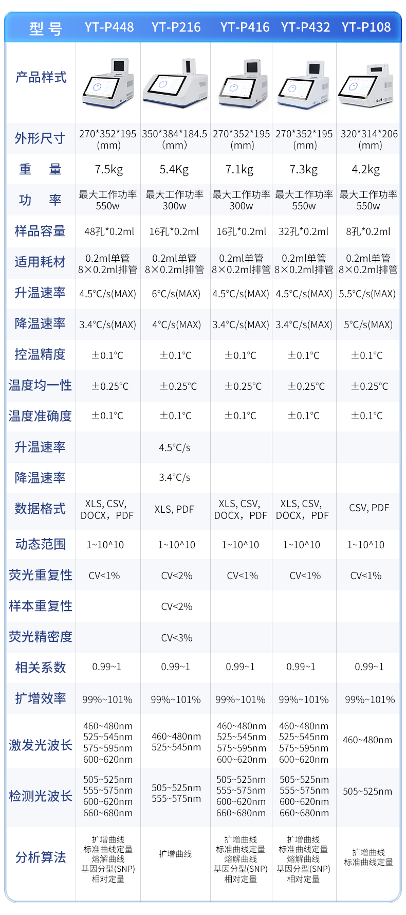 | 基本性能 | 外形尺寸:320*314*206 (mm) | 重量:4.2kg | 電源:220V | 功率:**工作功率550w | 操作系統:自帶Android操作系統 | 系統語言:中英文實時切換 | 操作環境參數 | 操作環境溫度:18~35℃ | 操作環境相對濕度:0%~85% | 運輸及儲存溫度:-20~55℃ | 運輸及儲存相對濕度:0%~85% | 系統性能 | 樣品容量:8孔*0.2ml | 樣品容積:15~100ul | 適用耗材:0.2ml單管、8×0.2ml排管 | 控溫范圍:4~99℃ | 熱蓋溫度:30℃-108℃(默認105℃,熱蓋溫度可調) | 溫控方式:高性能進口半導體 | 升溫速率:5.5℃/s(MAX) | 降溫速率:5℃/s(MAX) | 控溫精度:±0.1℃ | 溫度均一性 :±0.25℃ | 溫度準確度 :±0.1℃ | 操作功能:預設項目和分析參數,操作簡單方便 | 報告:支持報告自定義模塊 | 斷電保護:可以一鍵重啟中斷的實驗 | 儀器信息:擁有故障記錄,分析,提示的功能,更方便遠程解決問題 | 分析算法:擴增曲線,標準曲線定量 | 支持HRM檢測:支持 | 數據導出:可將實驗結果以圖形和表格的形式直接導出;詳細的數據報告內容包括實驗條件,數據坐標和表格,數據分析參數。 | 數據格式:CSV, PDF | TouchDown功能:支持時間和溫度遞增遞減模式 | 熒光檢測系統性能 | 檢測靈敏度:可檢測單拷貝基因 | 動態范圍:1~10^10 | 熒光重復性: CV<1%(使用某品牌試劑做8孔均一性實驗,8個孔的ct差值保持在0.5以內,cv保持在1%以內。)<> | 相關系數:0.99~1(每種濃度3個重復,梯度曲線的相關系數>0.99,擴增效率保持在99%~101%之間) | 擴增效率:99%~101% | 可信度:區分1000與2000拷貝濃度差異 | 激光光源:大功率LED(免維護,壽命長) | 檢測器:高靈敏度光電傳感器 | 激發和檢測傳播介質:耐高溫專業導光光纖 | 激發光波長 :460nm~480nm | 檢測光波長: 505nm~525nm |