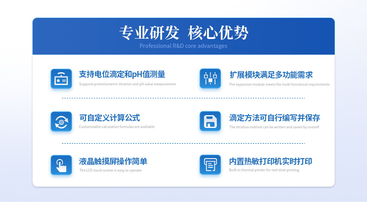 | 1、設備支持電位滴定和pH值測量;用戶選擇不同電極可進行酸堿滴定、氧化還原滴定、沉淀滴定、絡合滴定等多種滴定和pH測量; | 2、用戶可選配電導滴定、永停滴定等擴展模塊,滿足用戶多功能需求; | 3、設備對****中采用的電位滴定法均滿足,用戶可根據檢測需求選擇適配的電極即可; | 4、支持動態滴定、等量滴定、手動滴定的滴定方式,可預設滴定終點或自動識別終點滴定,方便用戶根據樣品特性選擇**滴定工作流程; | 5、可自定義計算公式,根據反應的化學方程式提前設置好計算公式,滴定完成后將自動獲得待測物含量; | 6、滴定方法可自行編寫并保存,形成滴定方法快捷模式,在使用時可直接選擇運行,滴定方法至少可保存100種; | 7、設備可作為實驗室常規手動滴定的滴定裝置使用;計量泵替代滴定管,磁力攪拌功能替代手動搖晃錐形瓶的工作; |