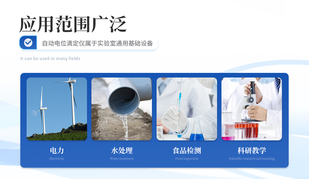 | 自動電位滴定儀屬于實驗室通用基礎設備,使用非常廣泛,可應用在食品、藥檢、疾控、商檢、水處理、石油、化工、海洋、電力、環保、新能源、教學、科研等相關領域。 |