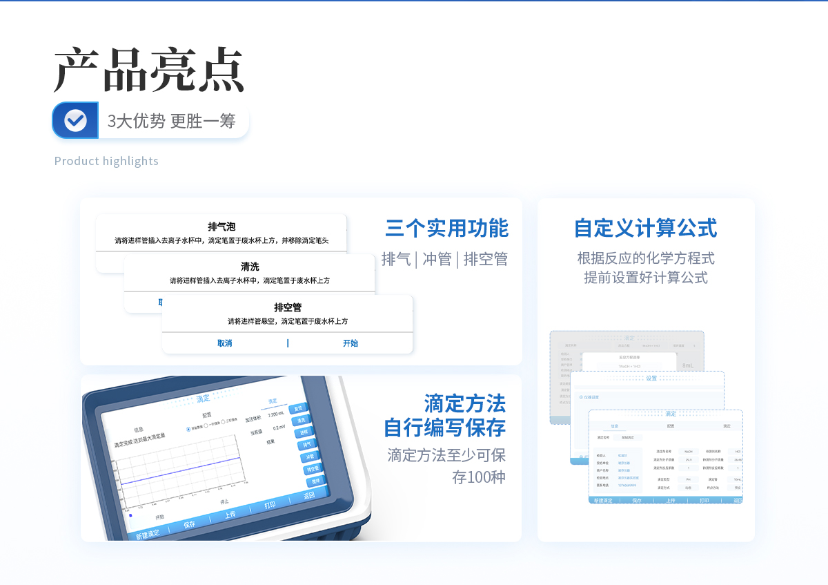 (1)排氣,可將滴定管或管路內的氣泡排出,避免氣泡帶來的滴定誤差; (2)沖管,可以*少的試劑消耗量使管路內充滿試劑,實現節省試劑的同時減少試劑混合引入的滴定誤差; (3)排空管,可在實驗完成后將管路中的液體收集到滴定管內,避免在拆卸管路時產生藥液濺灑問題。 |
